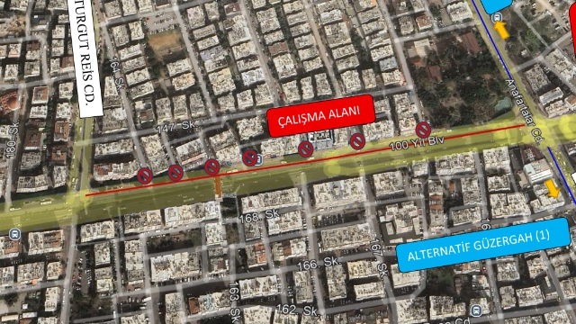 Çalışma kapsamında 100. Yıl Bulvarı’nın ( Şehir Merkezi istikametinden Konyaaltı gidiş yönü) Anafartalar Caddesi (Güllük) ile Turgut Reis Caddesi arasında kalan bölümü 15 Şubat Pazar günü sabah 07:00 itibariyle trafiğe kapatılacak. Yolda yoğun bir çalışma yapılarak 16 Şubat Pazartesi günü sabah saat 06:00’da yolun trafiğe açılması planlanıyor. Çalışma süresince sürücülerin, alternatif güzergâhları kullanmaları istendi.