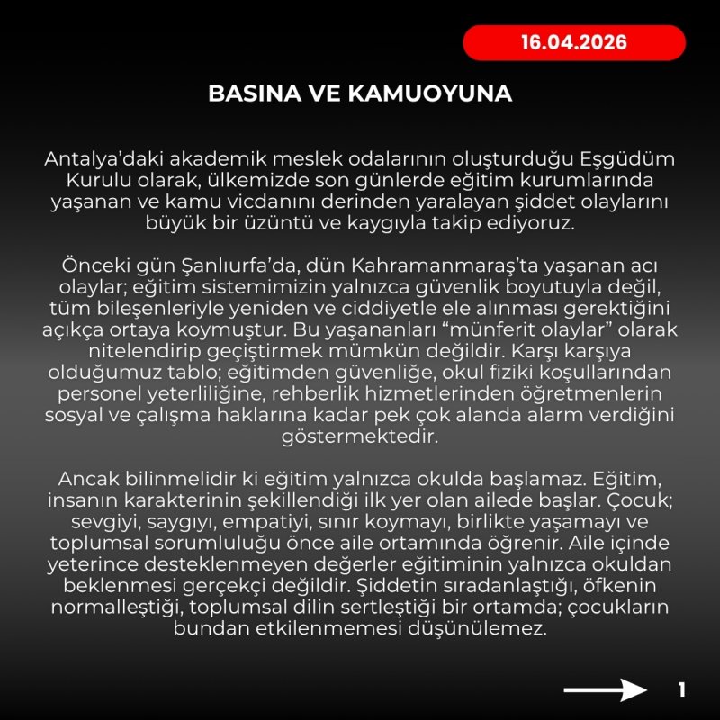 Antalya’daki akademik meslek odalarının oluşturduğu Eşgüdüm Kurulu, Kahramanmaraş ve Şanlıurfa’da yaşanan silahlı okul baskınlarının ardından açıklamalarda bulundu. Açıklamadan yaşanan şiddet olaylarının büyük bir üzüntü ve kaygı ile takip edildiği kaydedildi. Açıklamada, “Önceki gün Şanlıurfa’da, dün Kahramanmaraş’ta yaşanan acı olaylar; eğitim sistemimizin yalnızca güvenlik boyutuyla değil, tüm bileşenleriyle yeniden ve ciddiyetle ele alınması gerektiğini açıkça ortaya koymuştur.” denildi. Olayların “münferit olaylar” olarak nitelendirilerek geçiştirilmesinin mümkün olmadığını kaydeden Antalya Meslek Odaları Eşgüdüm Kurulu, “Karşı karşıya olduğumuz tablo; eğitimden güvenliğe, okul fiziki koşullarından personel yeterliliğine, rehberlik hizmetlerinden öğretmenlerin sosyal ve çalışma haklarına kadar pek çok alanda alarm verdiğini göstermektedir.” ifadelerine yer verdi.