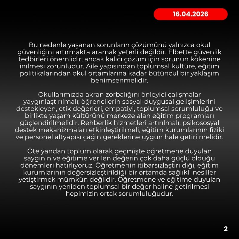 Rehberlik hizmetleri artırılmalı, psikososyal destek mekanizmaları etkinleştirilmeli, eğitim kurumlarının fiziki ve personel altyapısı çağın gereklerine uygun hale getirilmeli.” açıklamasında bulundu.