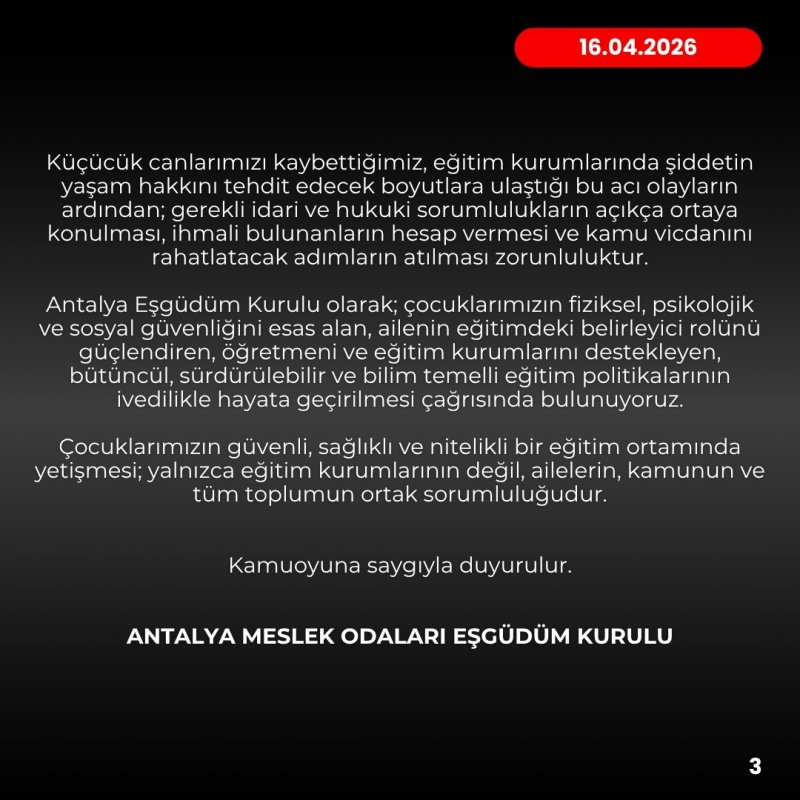 Antalya Meslek Odaları Eşgüdüm Kurulu, “Öte yandan toplum olarak geçmişte öğretmene duyulan saygının ve eğitime verilen değerin çok daha güçlü olduğu dönemleri hatırlıyoruz. Öğretmenin itibarsızlaştırıldığı, eğitim kurumlarının değersizleştirildiği bir ortamda sağlıklı nesiller yetiştirmek mümkün değildir. Öğretmene ve eğitime duyulan saygının yeniden toplumsal bir değer haline getirilmesi hepimizin ortak sorumluluğudur. Küçücük canlarımızı kaybettiğimiz, eğitim kurumlarında şiddetin yaşam hakkını tehdit edecek boyutlara ulaştığı bu acı olayların ardından; gerekli idari ve hukuki sorumlulukların açıkça ortaya konulması, ihmali bulunanların hesap vermesi ve kamu vicdanını rahatlatacak adımların atılması zorunluluktur.” ifadelerine yer verdi.