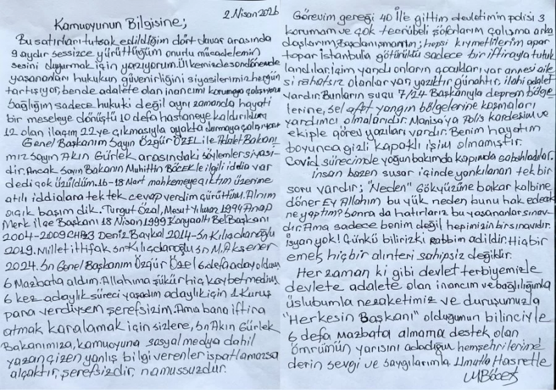 Genel Başkanım Sayın Özgür Özel ile Adalet Bakanımız Sayın Akın Gürlek arasındaki söylemler siyasidir. Ancak Sayın Bakanın Muhittin Böcek’le ilgili iddia var demesine çok üzüldüm. 16-18 Mart mahkemeye çıktım. Üzerime atılı iddialara tek tek cevap verdim, çürüttüm. Alnım açık başım dik. Turgut Özal, Mesut Yılmaz, 1994 Anap Merkez İlçe Başkanı, 18 Nisan 1999 Konyaaltı Belediye Başkanı, 2004-2009 CHP Deniz Baykal, 2014 Sayın Kılıçdaroğlu, 2019 Millet İttifakı Sayın Kılıçdaroğlu, Sayın Meral Akşener 2024. Sayın Genel Başkanım Özgür Özel 6 defa aday oldum; 6 mazbata aldım. Allahıma şükür hiç kaybetmedim.